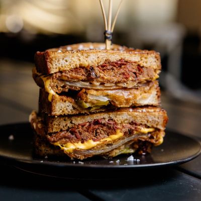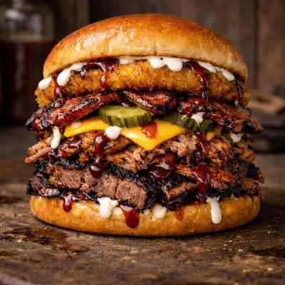 16 hour smoked wagyu brisket, 14 hour pulled pork, glazed bacon, american cheese, onion ring, pickles, Q-BBQ and Bama White Sauce