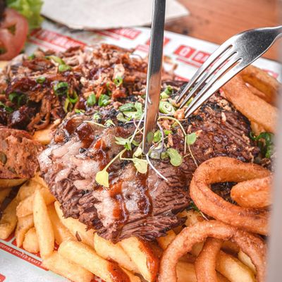 16-Hour Wood-Fire Smoked Wagyu (MB7+) Brisket with our Wild-Pepper Rub, Crispy Skin-On Fries, Atchara (house pickled slaw), Q-BBQ Sauce