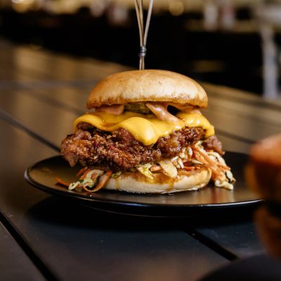 Hot honey fried chicken with potato crisp, pickles, slaw, American cheese & Alabama Ranch sauce
